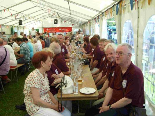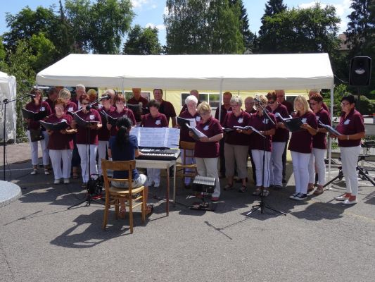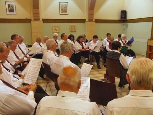 Im August waren wir wieder eingeladen, den Sonntagsfrühschoppen bei der Feuerwehr Neuweiler musikalisch zu umrahmen. Leider fällt diese Feierlichkeit in die Ferienzeit, so dass unsere Chorleiterin in ihrem wohlverdienten Urlaub weilt. Deshalb muss auch in diesem Jahr der Vorsitzende als Hilfs-Chorleiter ran. Mit weit ausholender Gestik weiß er, den Chor zur Höchstleistung anzuspornen.