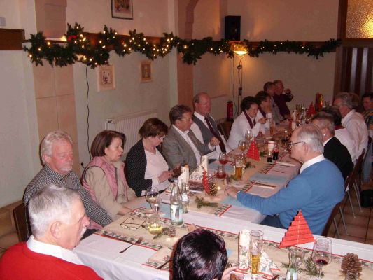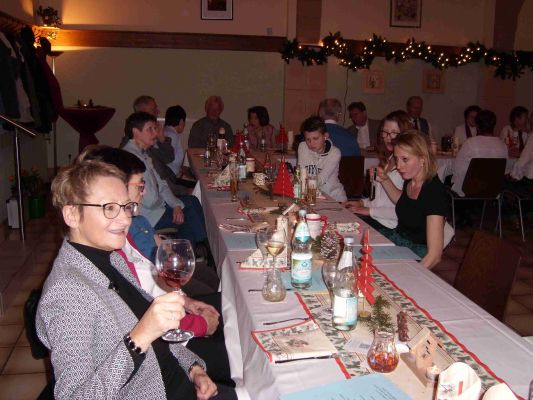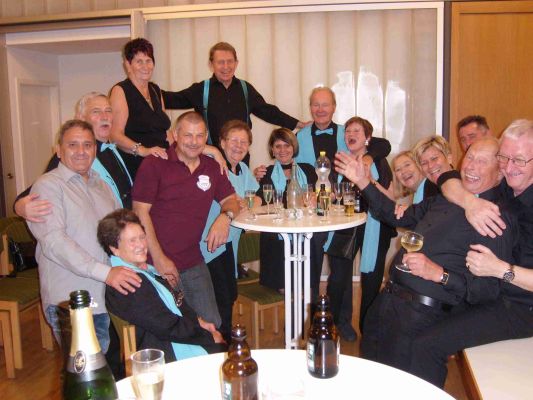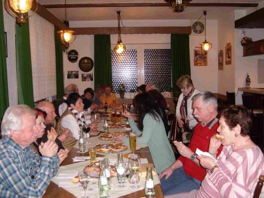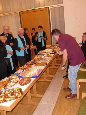 Horst (vorne links) und „Thomas“ Joachim (am Kopfende hinten) haben zu einem kleinen Imbiss geladen, dem sogar die Chorleiterin (sitzend, dritte von rechts) nicht abgeneigt ist.