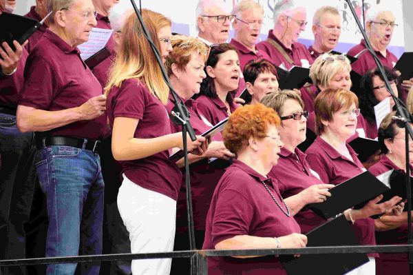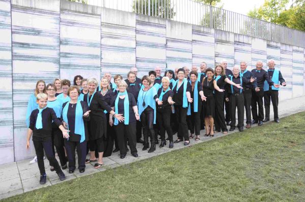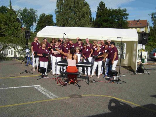 A apropos Werbung: Für einen Flyer, der neue Sänger auf uns aufmerksam machen soll, musste ein schönes Bild des Chors her. Folglich trafen wir uns auf dem Schulhof der Pestalozzischule in Neuweiler, bestellten den Alois Daniel von den Hofer Nachrichten und ließen uns ablichten: 29 Sängerinnen und Sänger (einer fehlte leider) plus Chorleiterin.