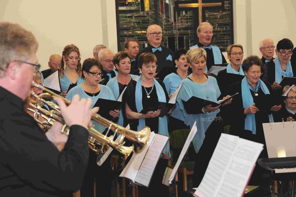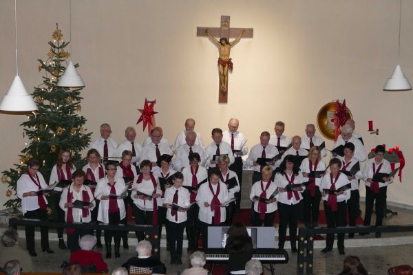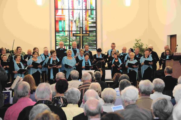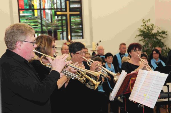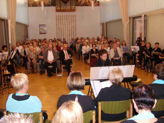 Und dann war er da, der Tag, dem wir entgegengezittert hatten: Nicht nur ein-zwei Auftritte mit jeweils drei Liedern, nein, einen ganzen Abend – mindestens 1,5 Stunden – wollten wir gestalten. Vorweg: Die Kirche, die uns die evangelische Gemeinde freundlicherweise zur Verfügung gestellt hatte, war bis zum letzten Platz gefüllt; selbst auf der Empore, die eigentlich gar nicht vorgesehen war, drängte sich unser Publikum. Als Gäste hatten wir uns den Posaunenchor der evangelischen Kirche und unsere „Chefin“ – selbst begnadete Pianistin – eingeladen. Seht die Bilder – mehr braucht es nicht, glaube ich.