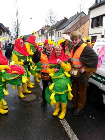 Die stv. Kassiererin der SVE (2. von rechts) ist die "Chefin" der Hühner, Vorsitzender und Schriftführer (von rechts) der SVE sind als Begleitpersonal beim Faschingsumzug dabei. Links grinsend der Betreuer unserer Homepage.