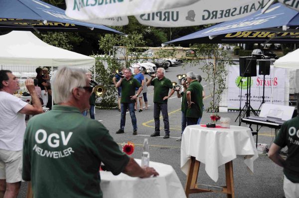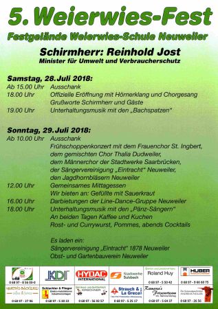 Ende Juli stand das 5. Weier-Wies-Fest – auch dies ein Jubiläum – auf dem Programm. Aus Anlass der verschiedenen Jubelereignisse, die hier zusammenkamen, wurde das Programm ein wenig auf“gemotzt“. Als Schirmherr war ein Mitglied der saarländischen Landesregierung eingeladen: Umweltminister Reinhold Jost ließ es sich nicht nehmen, den Festreigen zu eröffnen. Neben dem üblichen Unterhaltungsprogramm mit Jagdhornbläsern, Line-Dancern und abendlicher Unterhaltungsmusik stand auch ein Frühschoppenkonzert am Sonntagmorgen auf dem Programm.
