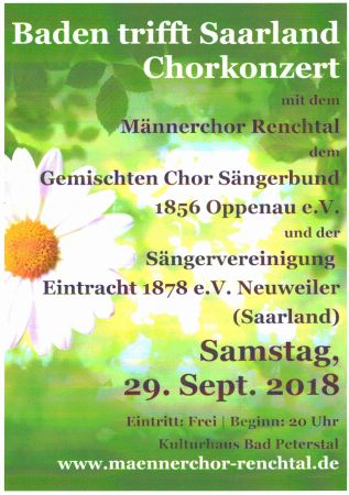 "Baden trifft Saarland" So hatte der Männerchor Renchtal das Chorkonzert betitelt, zu dem er die Sängervereinigung „Eintracht“ 1878 Neuweiler eingeladen hatte. Ein weiterer Gast-Chor war der neu formierte „Gemischte Chor Sängerbund 1856 Oppenau e.V.“ Die Gemeinde Bad Peterstal-Griesbach im Schwarzwald hatte alles vorbereitet, damit das Konzert am Abend des 29. September 2018 zum Erfolg wurde. Auf Grund der sehr positiven Resonanz wurde dann auch beschlossen, dass ein Gegenbesuch der Badener in Neuweiler für 2020 ins Auge zu fassen wäre: Der hiesige Vorsitzende sollte bei seinem für das kommende Frühjahr geplanten Besuch im Renchtal die entsprechenden Weichen stellen.