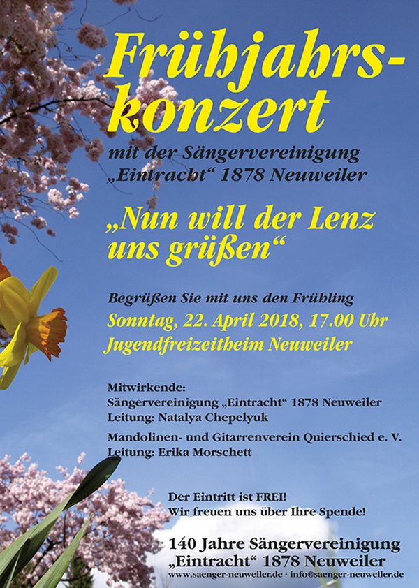 „Nun will der Lenz uns grüßen“ – unter diesem Motto lud die Sängervereinigung zu ihrem Frühjahrskonzert ins Jugendfreizeitheim ein. Im proppenvoll besetzten Festsaal konnte der Chor, dieses Mal unterstützt vom Gitarren- und Mandolinenverein Quierschied, sein Publikum überzeugen. Mit wohlausgewogenen Worten, gewürzt mit einigen Pointen, führte Michael Bleif gekonnt durch das bunte Programm.