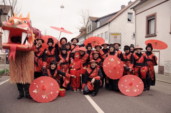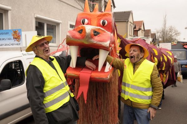 Faschingsumzug in St. Ingbert – dieses Mal treten die Hühner aus Neuweiler „im Zeichen des Drachen“ auf.