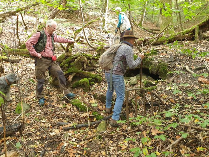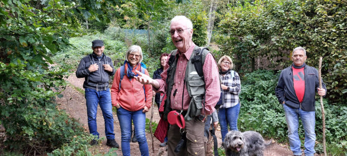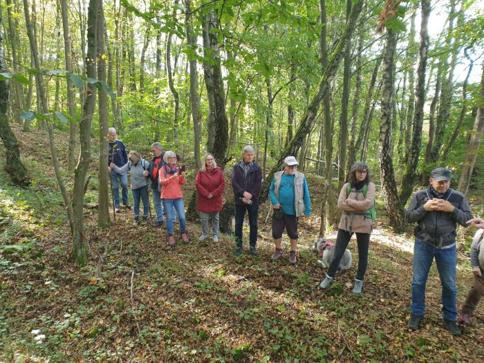 Aus seiner früheren Tätigkeit im Wald konnte nunmehr der Vorsitzende der SVE hier etliches beitragen – und lud seine Sängerfamilie zu einem Spaziergang von der Schnappach über die Sechs-Eichen-Höhe bis nach St. Ingbert ein: zu den „Zeugen“ des ehemaligen Bergbaus auf der bayrischen Seite des Sulzbachs: Die Wandergruppe – die meisten von ihnen sind Sulzbacher – war bass erstaunt, als sie sahen, was da tatsächlich noch zu finden ist: Die Wanderung begann an der Fischgrät-Bergehalde hinter der Jahnturnhalle in Sulzbach, führte zu Resten von Baulichkeiten des „untergegangenen“ Dorfes Schnappach und einem verfallenen Stollenmundloch hinter dem Schnappacher Friedhof, entlang alter, zum Teil wunderschön restaurierter Baulichkeiten, die noch aus der Zeit des florierenden bayrischen Bergbaus stammen (Untere und Obere Anlage) – und selbstverständlich zu dem Bauwerk, welches erst das Interesse an dieser Wanderung hervorgerufen hatte: der Über-Tage-Bau des Rettungs- und Lüftungsschachtes.